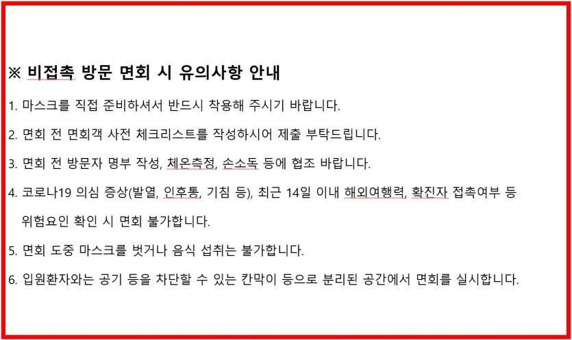 9월 13일~9월 26일 한시적 면회 시행 페이지 정보 작성자 경기도립노인전문동두천병원 댓글 0건 조회 17,898회 작성일 21-09-07 14:22 목록 본문 경기도립노인전문동두천병원입니다. 9월 13일~9월 26일 한시적으로 면회 시행합니다. 첨부한 면회 기준 및 수칙 확인하여 해당 병동으로 사전예약 부탁드립니다.접촉면회는 환자,보호자 모두 백신2차접종 2주 경과/평일(공휴일제외)에만 가능하며,비접촉면회는 모든요일,모든환자 가능합니다 병동으로 사전예약필수,면회객 2명 제한봉선화:031-860-4151~2진달래:031-860-4153~4무궁화:031-860-4155~6민들레:031-860-4157~8 이전글9월21일 추석 당일 60-3 버스 운행 변경 안내 21.09.16 다음글식자재 업체 입찰 공고 21.09.01 댓글 0 댓글목록 등록된 댓글이 없습니다.